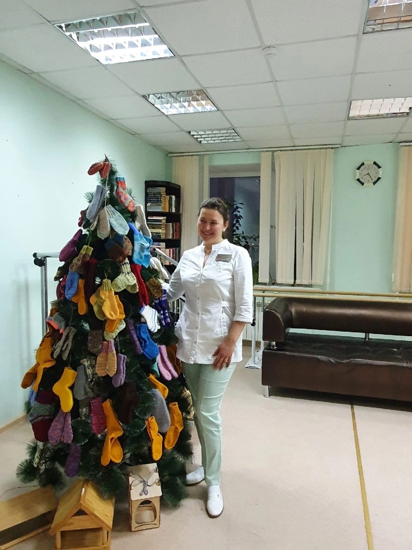 Еще она придумала проект «Чудо-дерево» - да-да, то самое дерево, как у Корнея Чуковского, на котором «растут» вязаные носочки да чулочки. Только разница лишь в том, что на больничном чудо-дереве они связаны руками пациентов отделения, в котором работает Динара. Своих подопечных она ласково называет «бабусяками», рассказывает, что вязание помогает им после инсультов восстанавливать мелкую моторику. Вяжут не только бабусяки, но и дедусяки – и хорошо вяжут.