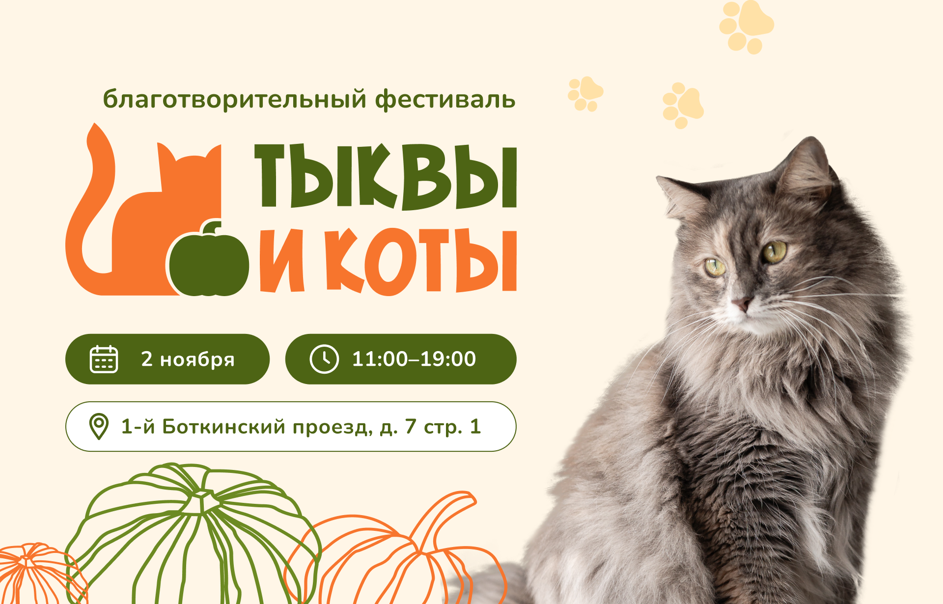 Фестиваль «Тыквы и Коты» пройдет 2 ноября с 11:00 до 19:00 в центре «Благосфера»: г. Москва, 1-й Боткинский пр-д, д.7, стр.1 (м. Динамо).