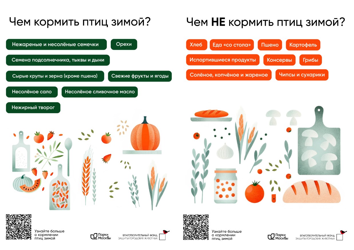 Фонд защиты городских животных совместно с «Парками Москвы» запустили голосование за оформление полезных карточек о кормлении пернатых.