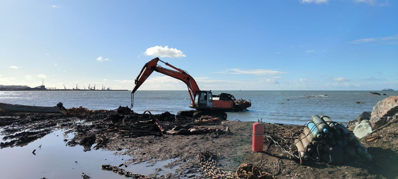 Очистка бухты Лососей от останков брошенных судов продолжается по нацпроекту «Экологическое благополучие». Ржавый металл вытягивают на берег с помощью системы блоков и экскаваторов. После разделки он отправится на переработку.